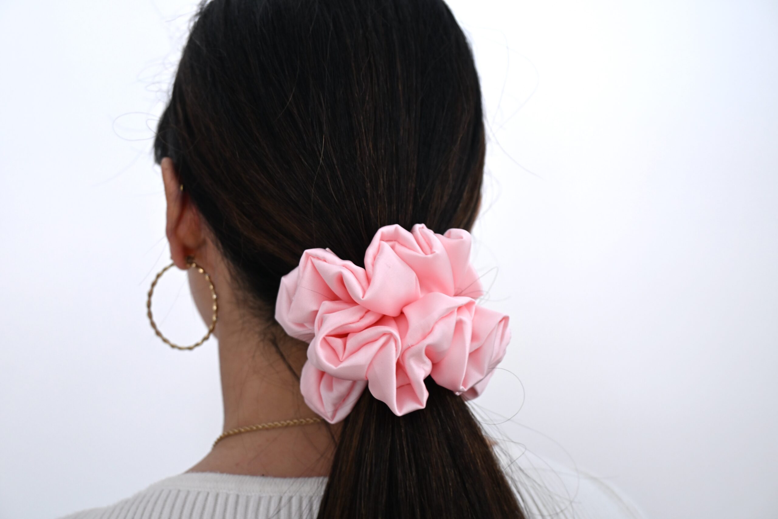 Dodaj swoim fryzurom odrobinę klasy dzięki tej wyjątkowo eleganckiej scrunchie wykonanej z miękkiej, delikatnie połyskującej satyny z dodatkiem jedwabiu. Odcień jasnego różu  nadaje jej luksusowego charakteru, a materiał jest łagodny dla włosów — nie wyrywa, nie plącze i minimalizuje powstawanie odgnieceń.
