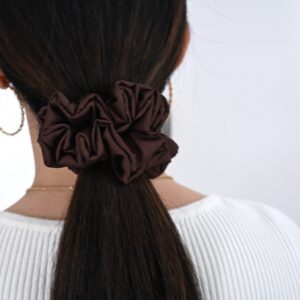 Dodaj swoim fryzurom odrobinę klasy dzięki tej wyjątkowo eleganckiej scrunchie wykonanej z miękkiej, delikatnie połyskującej satyny z dodatkiem jedwabiu. Odcień brązu  nadaje jej luksusowego charakteru, a materiał jest łagodny dla włosów — nie wyrywa, nie plącze i minimalizuje powstawanie odgnieceń.